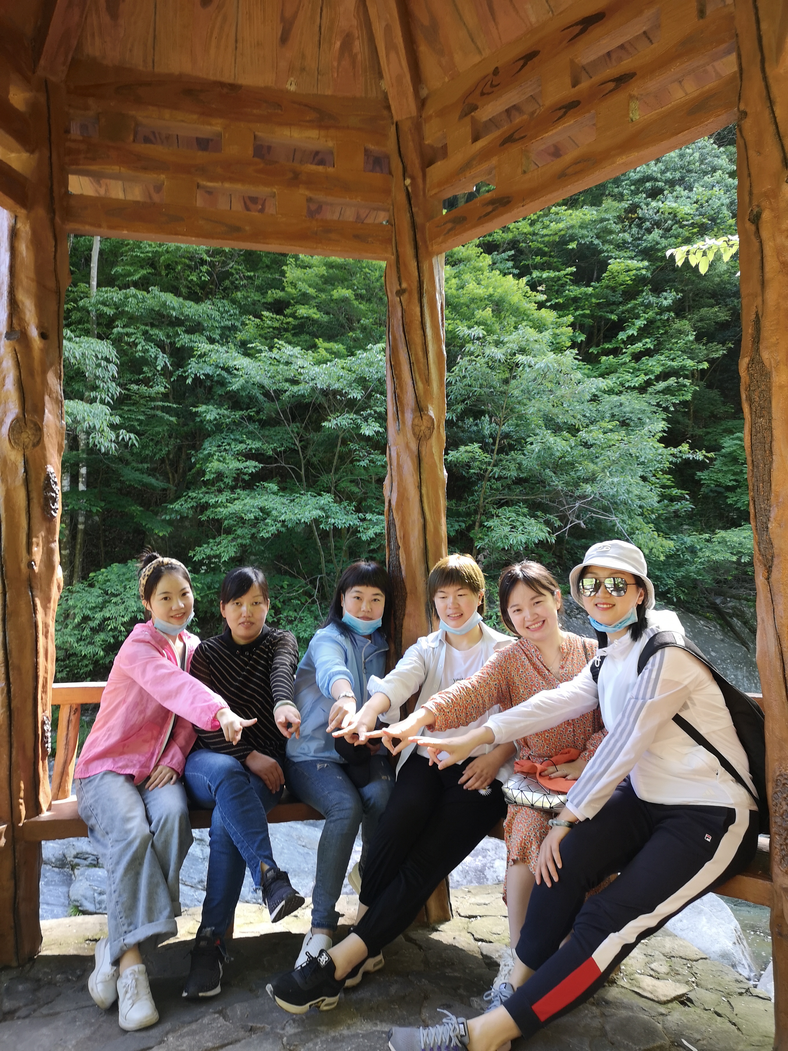 員工們步入蜿蜒在白馬大峽谷森林中的棧道,仿佛把沿線的美景都拴在了一起。整個棧道,或原木、或石塊鋪就、或棧道凌空,無論路、橋、亭、閣都充盈著山林野趣。