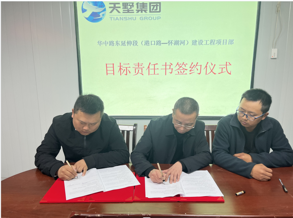 為全面推進華中路項目部各項工作任務,確保2024年1月10日箱涵完工、6月10日預驗收。11月22日晚上,項目部舉行了責任落實會議,集團行政副總張勤飛、項目經理汪齊生、生產經理汪春鳴現場簽訂了目標責任書。