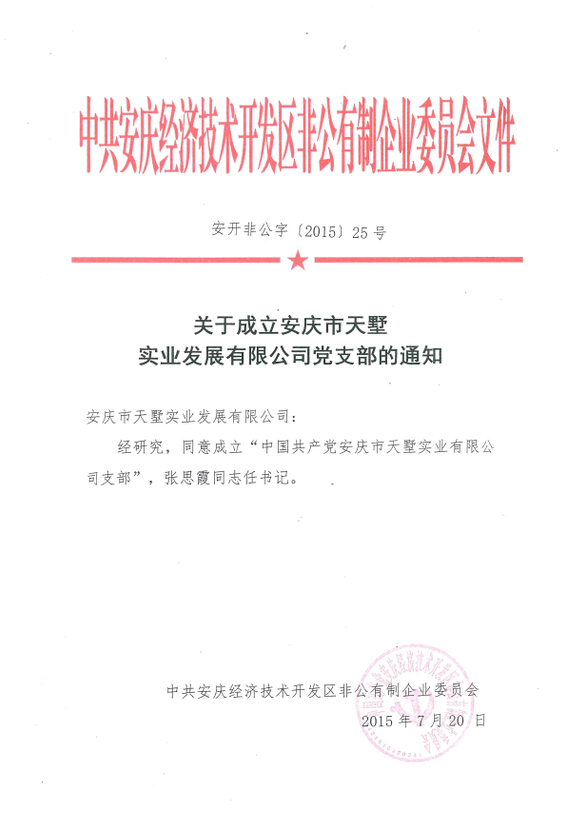 7月,恰逢中國(guó)共產(chǎn)黨成立94周年的生日,我公司成立黨支部的申請(qǐng)終獲批復(fù),經(jīng)上級(jí)黨委研究決定,同意成立“中國(guó)共產(chǎn)黨安慶市天墅實(shí)業(yè)發(fā)展有限公司黨支部”,張思霞同志任黨支部書記。