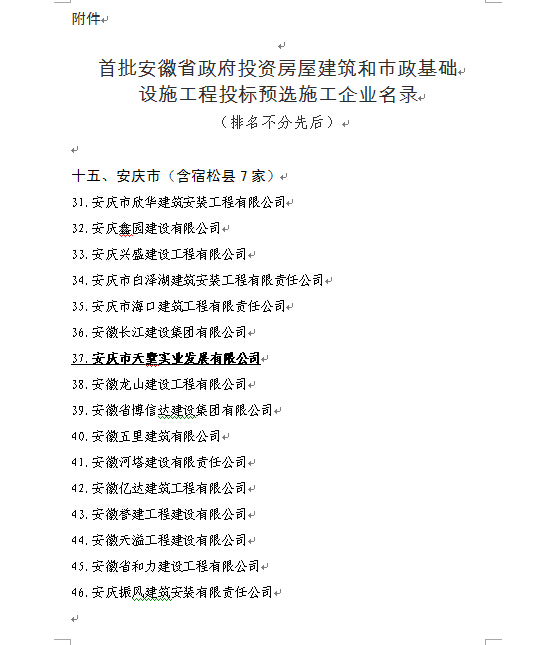 日前,安徽省住房和城鄉建設廳公布了首批安徽省政府投資房屋建筑和市政基礎設施工程投標預選施工企業名錄,我公司名列其中。