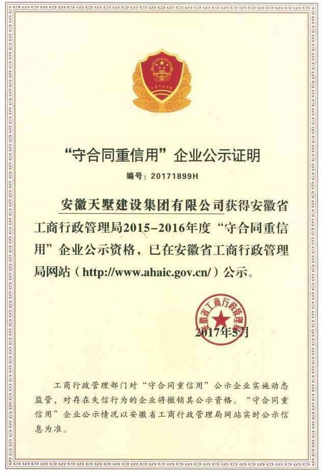 近日,天墅建設集團公司憑借完善的誠信體系和多年的誠信經營,再次被評定為2015-2016年度安徽省“守合同重信用企業”。據悉,公司此前已連續多年被評為安徽省“守合同重信用企業”。