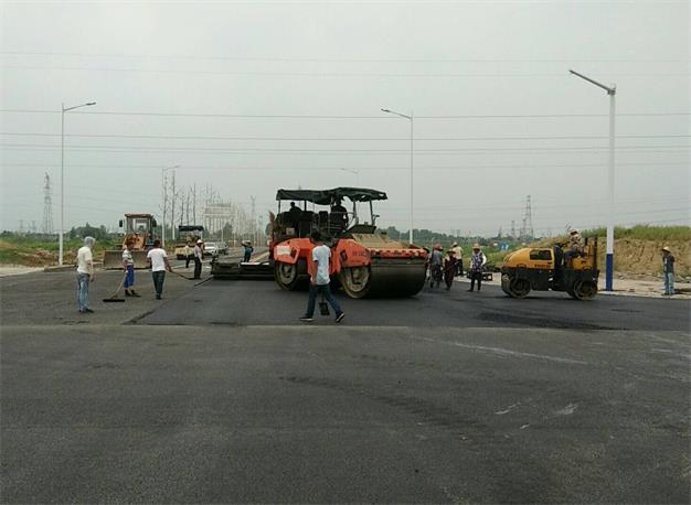 (圖為工人正在加緊對K0+047—K0+500路段進行瀝青攤鋪)
